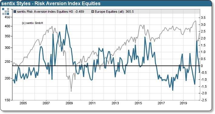 In den sentix-Daten, die übrigens am vergangenen Wochenende zum 1000sten Mal unter mehr als 5.000 Investoren weltweit ermittelt wurden, ist die Corona-Krise leicht zu erkennen. Panik im Sentiment, eine Unterinvestierung der Anleger. Und eine hohe Risikoaversion im sentix Risikoaversions-Index.