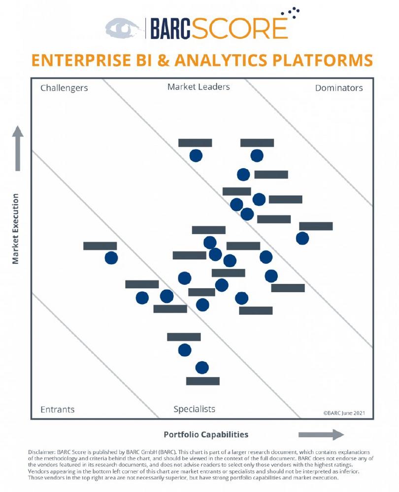 Das Analystenhaus BARC (Business Application Research Center) präsentiert den BARC Score Enterprise BI & Analytics Platforms. Der BARC Score bewertet und vergleicht 21 global marktrelevante Hersteller von modernen Enterprise Business Intelligence & Analytics Plattformen im globalen Markt. Die Grafik mitsamt der englischsprachigen Software-Evaluationen sind ab dem 28. Juni 2021 auf www.barc.de/scores erhältlich.