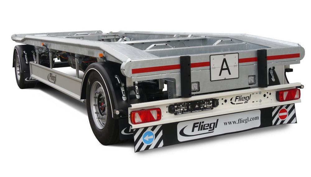 Präsentiert werden der Fliegl Abroller ZPS 180 A in Mega Z Ausführung. Behälter mit bis zu sieben Meter Länge finden auf dem ZPS 180 Platz, die maximale Nutzlast beträgt bis zu 14.800 kg bei einem Leergewicht von ab 3.200 kg. Eine pneumatische Vierpunkt-Containerverriegelung am Boden sorgt für Sicherheit. Die Oberseite der beiden Längsträger ist als Behälterrollenlaufbahn und daher besonders verschleißfest ausgeführt.