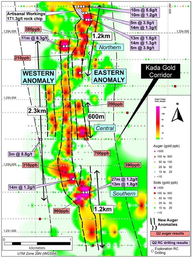Die Ergebnisse der Ergänzungsbohrungen im Schneckenbohrverfahren waren äußerst ermutigend, da mehrere parallele, von Norden nach Süden verlaufende Goldanomalien im Wirtsgestein (westliche und östliche Anomalien) mit einer kombinierten Streichlänge von insgesamt mehr als 5,5 km (Abbildung 1) abgegrenzt werden konnten. Diese ausgedehnten und kohärenten Goldanomalien sind Ausläufer jener Zonen, in denen Golden Rim vor kurzem seine ersten RC-Bohrungen absolvierte und hochgradige und/oder breite Zonen mit Goldoxidmineralisierung entdeckte (zu den Abschnitten zählen 11 m mit 6,3 g/t Gold, 10 m mit 5,6 g/t Gold und 27 m mit 1,2g/t Gold). Diese Goldoxidmineralisierung ist in nördlicher und südlicher Richtung sowie in der Tiefe nach wie vor offen.