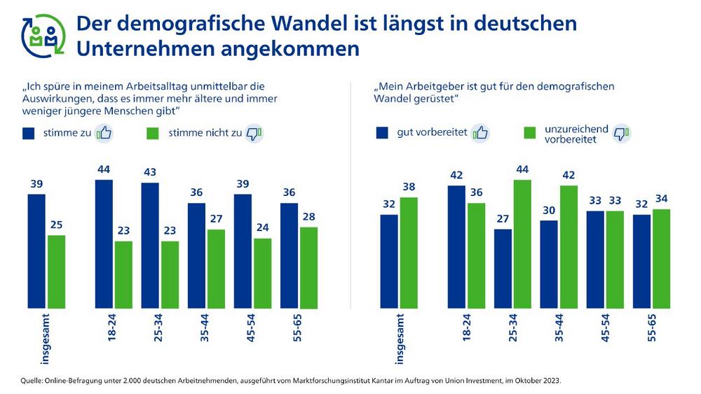 Der demografische Wandel ist längst kein theoretisches Szenario mehr, sondern im Alltag vieler Unternehmen angekommen. Vier von zehn Beschäftigten hierzulande nehmen bereits die Auswirkungen einer alternden Gesellschaft am Arbeitsplatz wahr (39 Prozent). Genauso viele rechnen damit, dass sich die Folgen in den kommenden fünf Jahren verschärfen werden. Wie gut die Unternehmen darauf vorbereitet sind, wird sehr unterschiedlich wahrgenommen. Mitarbeiterinnen und Mitarbeiter der Finanzbranche sehen ihren Arbeitgeber weniger gut gerüstet. Über alle Branchen hinweg berichtet immerhin jeder Vierte (24 Prozent) insbesondere aus der jüngeren und der älteren Generation über altersbedingte Diskriminierung am Arbeitsplatz. Gen Z und Gen Y zeigen sich durchaus leistungsbereit, leiden aber häufiger als Ältere unter einem Konflikt zwischen Beruf und Familie. Das sind die Ergebnisse einer Studie von Union Investment, für die 2.000 Berufstätige, Studierende und Auszubildende in Deutschland im Alter zwischen 18 und 65 Jahren befragt wurden.