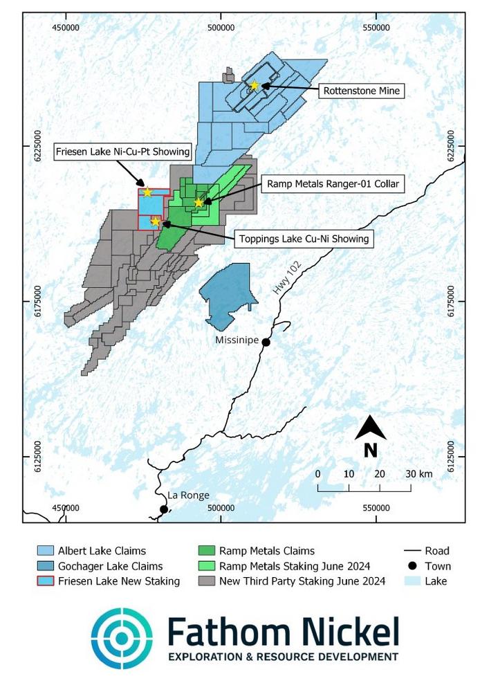 – Fathom hat vor kurzem 3 Mineralrechte (MC00019009, MC00019008, MC00019007) mit einer Gesamtfläche von 10.133 ha abgesteckt, um das Ni-Cu-Pt-Vorkommen Friesen Lake (Saskatchewan Mineral Deposit Index [„SMDI“] # 0928a) abzudecken, das unmittelbar an das Cu-Ni-Vorkommen Toppings Lake (SMDI #0866) angrenzt.