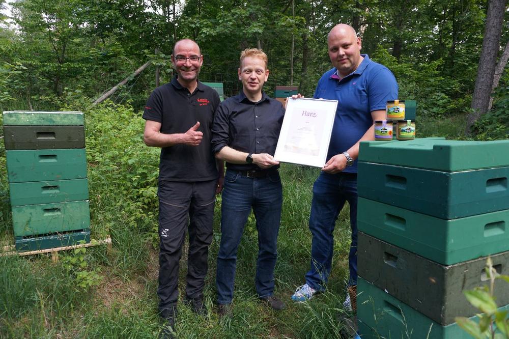 Mit Erfolg – in der Harzköhlerei Stemberghaus überreichte Andreas Lehmberg, stellvertretender Geschäftsführer des Harzer Tourismusverbandes, heute die „Typisch Harz“-Urkunde. „Wir freuen uns, mit dem Harzer Honig von Mathias Schäfer das Portfolio unserer Regionalmarke um ein weiteres qualitatives Produkt ergänzen zu können. So wird das Bewusstsein für nachhaltige Produkte und deren Bedeutung in der Region gestärkt.“ Auch Schäfer zeigt sich zufrieden: „Das ‚Typisch Harz‘-Logo kennzeichnet meinen Honig nun auch klar als originales Harzer Produkt“. Der Honig kann in der Harzköhlerei Stemberghaus, im neuen Typisch Harz – Regioshop & Kulturhalle an der Rappbodetalsperre, im Café am Markt in Wernigerode und in der Honigbox in Derenburg (Mittleren Mauerstraße 53) erworben werden.