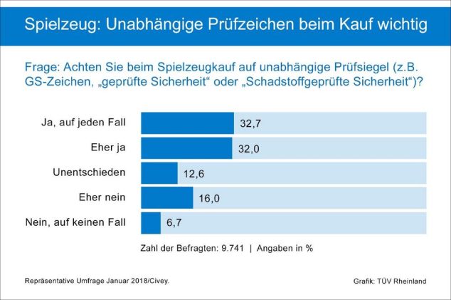Fast zwei Drittel aller Verbraucherinnen und Verbraucher in Deutschland achten beim Spielzeugkauf auf unabhängige Prüfsiegel, ein Drittel tut dies sogar in jedem Fall. Dies ergab eine repräsentative Umfrage des Meinungsforschungsinstituts Civey von Mitte Januar 2018 im Auftrag von TÜV Rheinland. Die Umfrage zur internationalen Spielwarenmesse in Nürnberg bestätigt nach Einschätzung der Fachleute von TÜV Rheinland […]