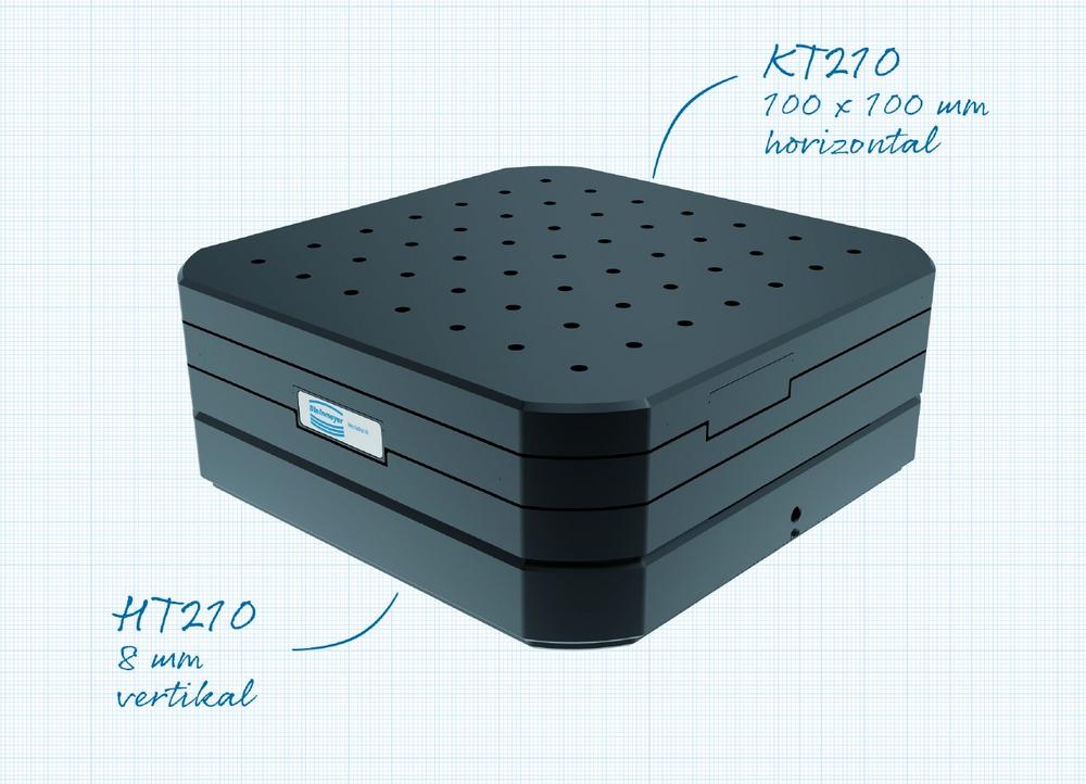 Der HT KT210 besteht aus einem Kreuztisch KT210 und einem Hubtisch HT210. Mit einer Bauhöhe von nur 80 mm und Außenmaßen von 210 x 210 mm stellt er minimale Anforderungen an den zur Verfügung stehenden Bauraum. Gleichzeitig integriert er Motoren, Kabelschlepp und einen Controller. Die integrierte Einheit aus XY-Tisch und Hubtisch verfügt über Verfahrwege von 100 x 100 mm auf den beiden horizontalen Achsen sowie einen Hub von 8 mm auf der vertikalen Achse. Die Wiederholgenauigkeit in der Ebene beträgt +- 2,7 µm und in der Höhe +- 5,2 µm.