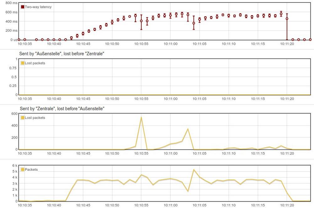 Nehmen wir das Beispiel eines Mitarbeiters in einer Außenstelle, der sich über die schlechte Qualität bei der VoIP-Telefonie am Tag zuvor beschwert. Anhand der Streckenmessung zwischen der Außenstelle und dem Rechenzentrum kann der Systemadministrator erkennen, dass genau zu der genannten Zeit große Datenmengen wie Updates, Backups etc. von der Außenstelle übertragen wurden. Das neue Feature stellt dabei die 2-Wege-Latenz in Korrelation zu Paketverlusten dar (vgl. Abb. 1). Diese Erkenntnisse helfen dem Systemadministrator bei der Konfiguration des Netzwerkes, so dass Qualitätsverluste beim VoIP künftig vermieden werden können. Ganz konkret kann ermittelt werden, welches System bzw. welche Anwendung zu welchem Zeitpunkt für schlechte Qualität verantwortlich ist. Der verursachende Netzwerkverkehr lässt sich dann mittels geeignetem QoS begrenzen oder zeitlich verschieben. Umgekehrt lässt sich die zugesagte Bandbreite und Latenz des ISPs zwischen Standorten dauerhaft überprüfen.
