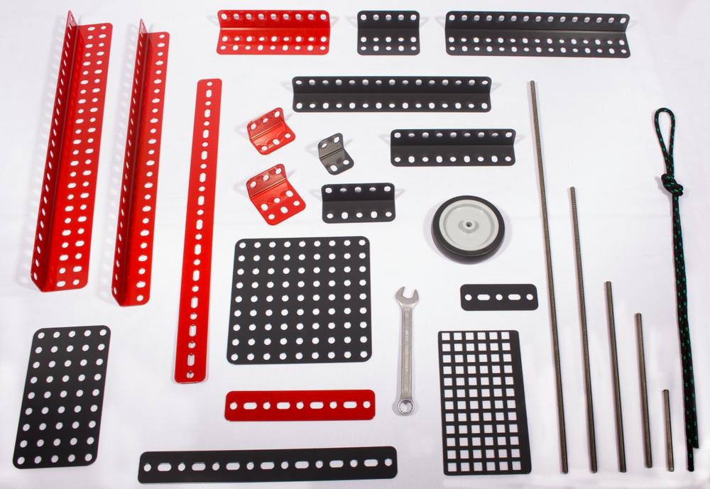 Aus insgesamt 3.507 Teilen allein zum Bauen besteht der neue Metallbausatz XXL. Bänder, Lochplatten und Winkel aus 1,5 cm dickem, pulverbeschichtetem Stahl, passende Schrauben, Muttern und Muffen sowie Spezialbauteile wie Räder, Gewindestangen, Blockseilrollen, Seilklemmen und Flechtleinen sind enthalten. Damit lässt sich vieles montieren, und zwar von vielen Kindern und Jugendlichen zusammen: Bis zu 35 Personen können sich lange und ausdauernd mit der Konstruktion von Autos, Kränen, Baggern, Brücken, Tischen und Stühlen oder Stahltieren beschäftigen. Je nach Alter und Geschicklichkeit fallen die Konstruktionen unterschiedlich groß und komplex aus.
