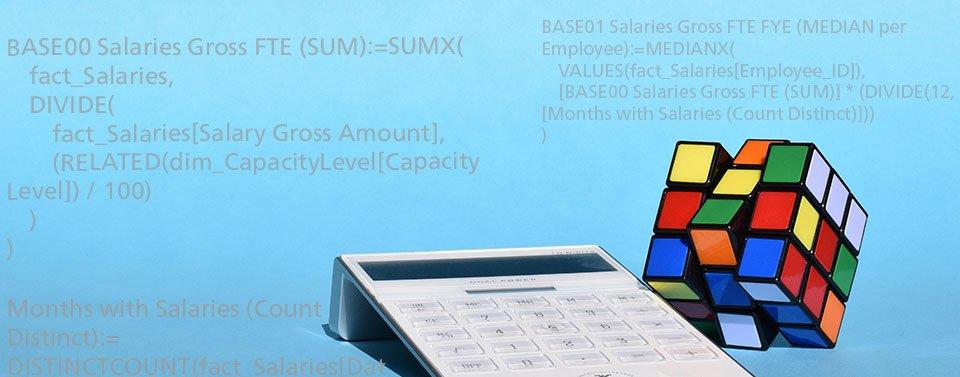 Ein schönes Beispiel für die Mächtigkeit, Eleganz, Einfachheit und intuitive Nutzung von DAX-basierten Measures innerhalb eines SSAS Tabular Modells ist eine der Implementierungen für die Umsetzung des Entgelttransparenzgesetzes in der noventum- Lösung HR-Analytics. Beim Entgelttransparenzgesetz geht es vereinfacht gesagt darum, dass Unternehmen ihren Mitarbeitern/innen unter gewissen Umständen eine durchschnittliche Lohnauskunft bereitstellen müssen. [Für fachliche Details zum Entgelttransparenzgesetz sei an dieser Stelle auf das Whitepaper von noventum-Berater Dr. Benjamin Klör verwiesen.] Technisch gesehen handelt es sich bei dieser Lohnauskunft streng genommen nicht um einen „Durchschnitt“, sondern um den „Median“ von Gehältern in einer bestimmten Vergleichsgruppe aus Mitarbeitern mit ähnlichen Eigenschaften. Das folgende Beispiel ist aber genauso mit Durchschnitt, Minimum und Maximum umsetzbar.
