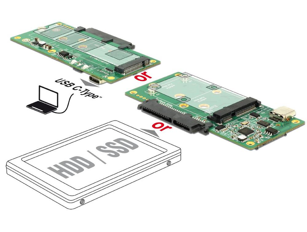 Dazu gehören eine 22-Pin-Buchse für eine SATA-SSD oder HDD-Festplatte, ein mSATA-Slot (half size/full size) und ein M.2 Key B Slot mit 67 Pin für den Anschluss einer M.2-SATA-SSD in den Formaten 2280, 2260 und 2242. Die Leistung des neuen Delock-Konverters, der SuperSpeed-Übertragungen bis zu 10 Gbps ermöglicht, basiert auf dem Chipsatz ASM1351 von Asmedia. Die Stromversorgung erfolgt direkt über einen 4-Pin-Anschluss. Der Schutz vor Kurzschlüssen und Überhitzung sowie ein ESD-Schutz sorgen für eine hohe Sicherheit bei der Nutzung.