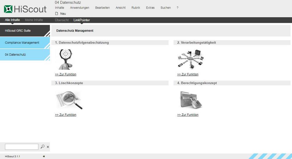 Der Funktionsumfang der Datenschutz-Management-Tools sollte genau geprüft werden. HiScout bietet mit seinem Compliance Tool eine komplette Übersicht über alle Assets einer Organisation. Sämtliche relevanten Daten stehen unter einer einheitlichen Oberfläche allen für den Datenschutz verantwortlichen Mitarbeitern und Managern mit einem entsprechenden Rollenkonzept zur Verfügung. Die Gesamtheit aller Daten von Systemen, Anwendungen und Datenbeständen sind an einer zentralen Stelle in einer Datenbank erfasst. Oftmals liefern bereits die unterschiedlichen Managementsysteme, die in den Unternehmen im Einsatz sind, wichtige Informationen. Diese lassen sich importieren oder referenzieren.