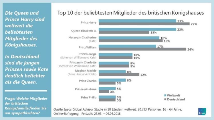 Die Queen und Prinz Harry sind derzeit die beliebtesten Mitglieder des britischen Königshauses weltweit. Jeweils 23 Prozent der Befragten in 28 Ländern stimmten für diese Kombination. Die internationale Studie von Ipsos ermittelte Prinz William (17%) und sein Frau Catherine (18%) auf den weiteren Topplätzen der Beliebtheitsskala. In Bezug auf seine Einstellung zu Großbritannien gab jeder […]