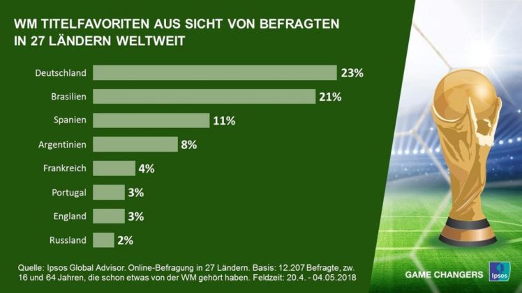 Deutschland und Brasilien werden nach einer weltweiten Umfrage in 27 Ländern des Markt- und Meinungsforschungsinstituts Ipsos als Gewinner der WM gehandelt. Knapp jeder vierte Befragte (23%), der schon einmal etwas von der diesjährigen WM gehört hat, glaubt an Deutschland als Sieger, gut jeder Fünfte (21%) setzt auf Brasilien. Spanien (11%) und Argentinien (8%) werden deutlich […]