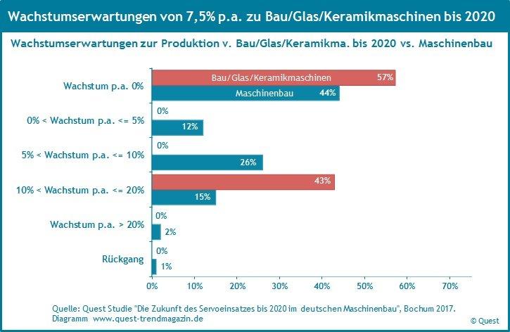 Bis 2020 erwarten die Hersteller von Bau-, Glas-, Keramikmaschinen ein Wachstum ihrer Maschinenproduktion von 7,5% pro Jahr. Diese Erwartung liegt um ein Drittel über den Wachstumserwartungen im Maschinenbau. Im Maschinenbau liegt die Wachstumserwartung bis 2020 bei 5,5% pro Jahr. Dies ist das Ergebnis einer Marktuntersuchung von Quest TechnoMarketing im deutschen Maschinenbau zum Servoeinsatz bis 2020.