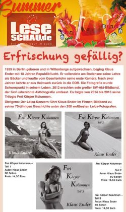1. Der Fotograf und Buchautor Klaus Ender ist bekannt für seine nackten Tatsachen, die er den Lesern poesievoll und in ästhetischer Form vermittelt. Als Bildautor der „DDR-Nackedeis“ in der Zeitschrift „Das Magazin“ und meist publizierter „EULENSPIEGEL“-Fotograf lässt er die Leser über die Schulter schauen. Seine zeitlosen Aktbilder entstanden in 50 Jahren. Sein Credo „Wer nackt […]