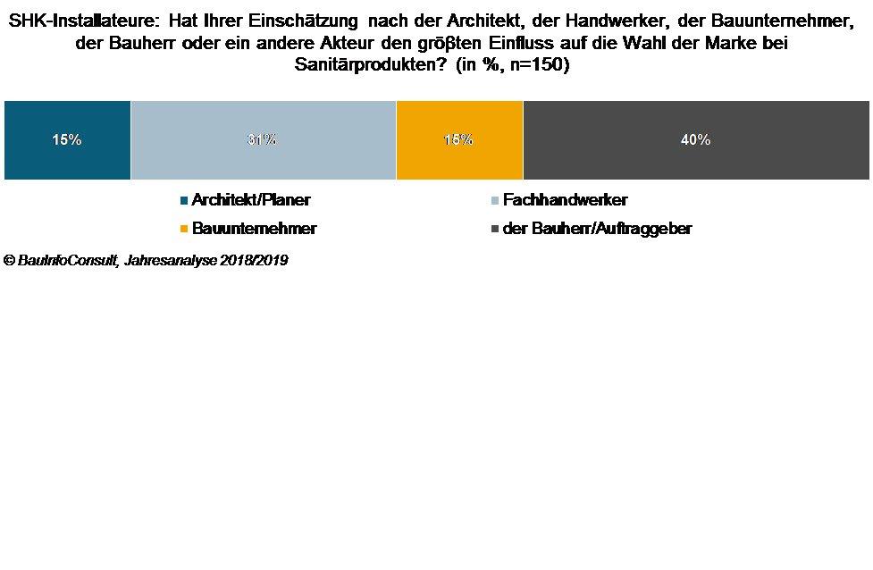 In telefonischen Interviews wurden 150 SHK-Installateure von den Düsseldorfer Marktforschern gefragt, welche Akteure am Bau ihrer eigenen Erfahrung nach den größten Einfluss auf die Wahl der Marke bei Sanitärprodukten haben. 40 Prozent der befragten SHK-Installateure gehen davon aus, dass die Bauherren selbst den größten Einfluss auf die zu verbauenden Marken im Sanitärbereich ausüben.