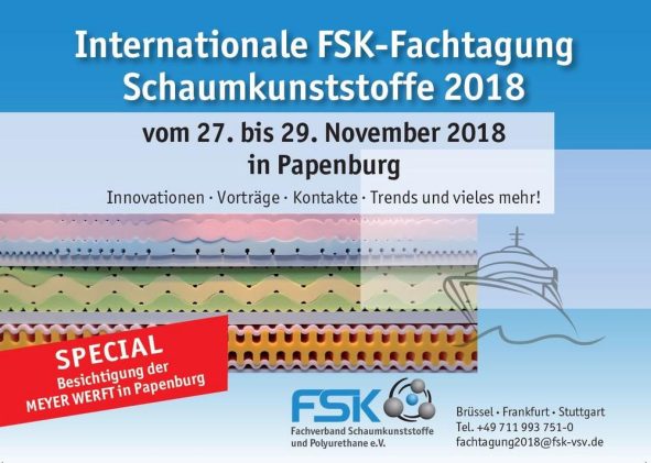 Mit der Internationalen Fachtagung Schaumstoffe 2018 bietet der Fachverband Schaumkunststoffe und Polyurethane e.V. (FSK) der Branche eine anerkannte Plattform. Das Branchenevent findet 2018 Ende November in Papenburg statt. Die diesjährige Internationale Fachtagung Schaumkunststoffe, zu der der Fachverband für Schaumkunststoffe und Polyurethane e.V. (FSK) einlädt, findet vom 27. bis 29. November in Papenburg statt. Die FSK-Fachtagung […]