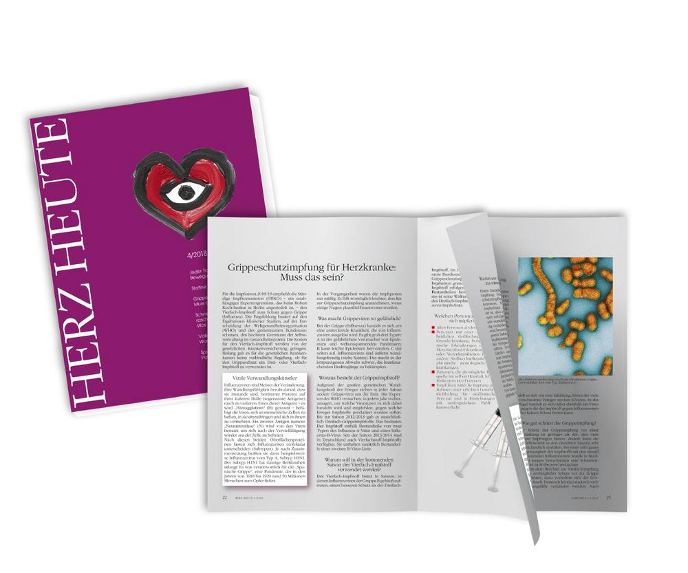 Die aktuelle Ausgabe von HERZ HEUTE 4/2018 mit dem Beitrag „Grippeschutzimpfung für Herzkranke: Muss das sein?“ (4 Seiten) ist kostenfrei erhältlich unter Tel. 069 955128400 oder per E-Mail unter bestellung@herzstiftung.de (Stichwort: Grippeschutzimpfung).