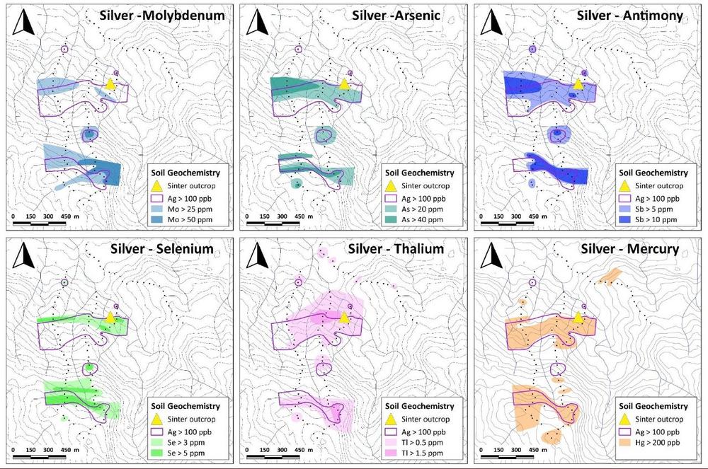Die Grat- und Stichprobenuntersuchung hat zwei verschiedene Bereiche der Metallanreicherung definiert, die etwa senkrecht zur Neigung der Topographie liegen (Abbildung 1). Die beiden Zonen sind bis zu 250 Meter breit und durch einen horizontalen Abstand von etwa 500 Metern und 200 Metern in der Höhe getrennt. Die Bereiche der Metallkonzentration sind nach Osten und Westen offen, wo zusätzliche Bodenproben erforderlich sind, um das volle Ausmaß des Anreicherungsbereichs zu bestimmen. Silber, das sich in den Böden des Cutucu-Gebirges als relativ unbeweglich erwiesen hat, stimmt weitgehend mit natürlich vorkommendem Arsen, Antimon, Selen, Thallium, Quecksilber und Molybdän überein. Die Suite der Pfadfinderelemente steht im Einklang mit den oberen Teilen eines epithermalen Gold-Silber-Targets mit "geringer Sulfidierung".
