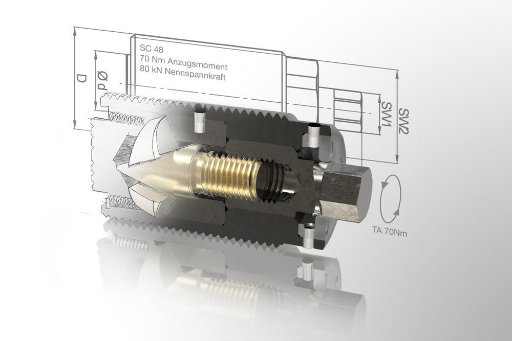 Die Kraftspannschraube SC enthält ein spezielles Innenleben, das als mechanischer Kraftverstärker wirkt. Es entstehen besonders hohe Spannkräfte bei vergleichsweise niedrigen Anzugsmomenten und größtmöglicher Betriebssicherheit. Das in jeder Position selbsthemmende Keilspannsystem bietet einen Spannhub von bis zu 3 mm.