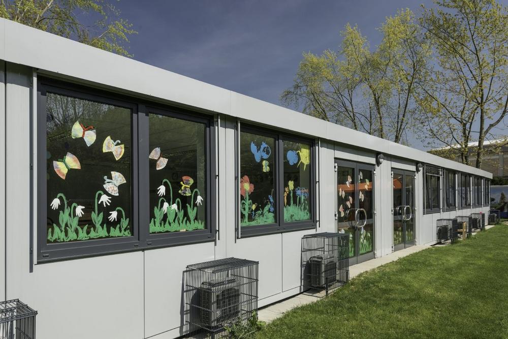 Um den kurzfristigen Bedarf während der Neubauphase zu decken, musste in der Heiligenröder Straße eine Interimslösung für die viergruppige Kita geschaffen werden. Mobile Mietgebäude der PLUS Serie von KLEUSBERG ermöglichen in solchen Fällen sofortige Abhilfe. Dieses gerade im Bildungs- und