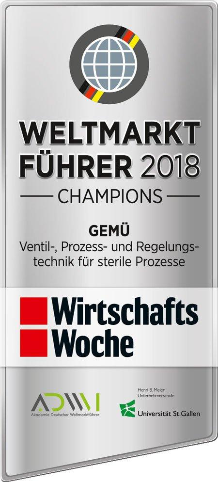 Zum Dritten Mal in Folge verleiht die WirtschaftsWoche dem Familienunternehmen GEMÜ Gebrüder Müller Apparatebau GmbH & Co. KG das WirtschaftsWoche-Qualitäts-siegel „Weltmarktführer 2018 – Champions“. Damit würdigt die WirtschaftsWoche die Aufnahme von GEMÜ in den Weltmarktführerindex im Segment „Armaturen und Automatisierungskomponenten: Ventil-, Prozess- und Regelungstechnik für sterile Prozesse“.