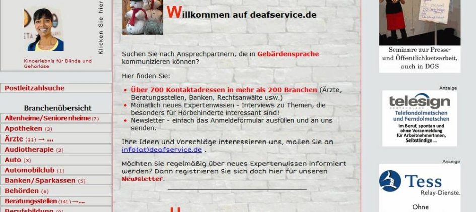 Seit neun Jahren ist www.deafservice.de eine der wichtigsten Anlaufstellen in Deutschland, wenn gehörlose Menschen nach Ansprechpartnern suchen, die gebärden können. Zurzeit sind über 700 bundesweite Kontaktdaten aus über 200 Branchen online. In Deutschland leben 16 Millionen Hörbehinderte, etwa 200.000 von ihnen unterhalten sich in Gebärdensprache. Für eine barrierefreie Unterhaltung, gerade bei sensiblen Themen ist es […]