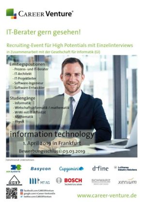 Sie wollen Karriere als IT-Consultant machen und freuen sich auf neue Herausforderungen und einen IT-Job? Sie sind als IT-Berater gerne gesehen! Bewerben Sie sich und lassen sich als einer von wenigen eingeladenen Teilnehmern der Recruiting-Veranstaltung CAREER Venture® information technology von uns persönlich betreuen. In der exklusiven und ruhigen Atmosphäre eines Top-Hotels führen Sie Ihre persönlichen Karrieregespräche […]