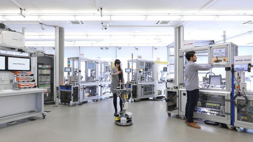 Die Arbeitsgruppe 1 „Smarte Infrastruktur“ arbeitet an einem dynamischen Sicherheitskonzept zur vereinfachten, teil- oder vollautomatisierten Zertifizierung, das in der Smart Factory KL Industrie-4.0-Anlage getestet wird. Das Konzept basiert auf einem industriellen Ethernet-Kommunikationsprotokoll. Die gesamte Anlage besteht aus vier räumlich voneinander getrennten Produktionslinien, die mithilfe eines Fahrerlosen Transportsystems, dem „Robotino“ miteinander verbunden sind. Wird der Not-Halt-Taster PITestop active von Pilz ausgelöst, solange sich der „Robotino“ frei zwischen den Modulen bewegt, wird ausschließlich der „Robotino“ gestoppt. Ist der „Robotino“ an eine Fertigungslinie angedockt, stoppt der Not-Halt-Taster die angeschlossene Linie. Die anderen Fertigungslinien können weiterhin produzieren. Dies kann Produktionsausfälle deutlich reduzieren. Damit konnte der Not-Halt-Taster erstmals flexibel über einzelne Fertigungslinien und nicht mehr nur über die komplette Anlage parametriert werden.