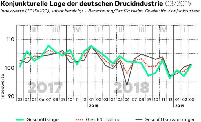 Nach einer vergleichsweise bescheidenen Entwicklung in den ersten zwei Monaten dieses Jahres zeigt sich das Geschäftsklima in der deutschen Druck und Medienindustrie im März 2019 wieder positiver. Der vom Bundesverband Druck und Medien berechnete Geschäftsklimaindex ist gegenüber dem Vormonatsstand um 2,5 Prozent auf 101,1 Zähler gestiegen. Gegenüber dem Vorjahresstand entwickelte er sich jedoch mit -1,2 […]
