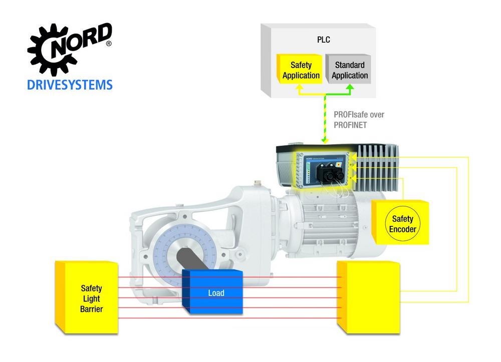 Funktionale Sicherheit gewinnt immer mehr an Bedeutung als ein grundlegender Bestandteil im zeitgemäßen Maschinen- und Anlagendesign und ist ein unverzichtbarer Aspekt der NORD-Antriebsysteme. Aktuell liefert NORD DRIVESYSTEMS in diesem Umfeld Frequenzumrichter mit integriertem STO und SS1. Sicherheitsgerichtete Kommunikation sowie sichere Bewegungsfunktionen gemäß der IEC 61800-5 bedient der Antriebsspezialist mit der PROFIsafe-Baugruppe NORD SK TU4-PNS. Funktionen wie SLS (Safety Limited Speed), SSR (Safe Speed Range), SDI (Safe Direction), SOS (Safe Operation Stop) und SSM (Safe Speed Monitor) lassen sich integrieren und erweitern die sicheren Stoppfunktionen der Antriebe. Damit bietet das PROFIsafe-Schnittstellenmodul umfassende Sicherheit für den zuverlässigen Betrieb von Anlagen und Maschinen.
