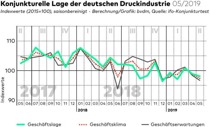 Das Geschäftsklima hat sich in der deutschen Druck- und Medienbranche auch im Mai 2019 nicht entspannt. Der vom Bundesverband Druck und Medien berechnete Geschäftsklimaindex sank gegenüber dem Vormonat um saisonbereinigte 1,7 Prozent von 98,6 auf 97,3 Zähler. Mit 6,1 Prozent entwickelte sich der Index auch im Vorjahresvergleich rückläufig. Der Negativtrend der vergangenen Monate hat sich nach einer kurzen […]