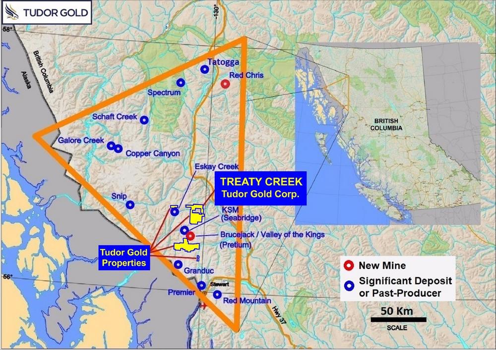 Tudor Gold ist ein Explorationsunternehmen mit Fokus auf Edelmetall- und Basismetallprojekten in der kanadischen Provinz British Columbia. Die Projekte befinden sich im berühmten ‚Goldenen Dreieck‘, einem Gebiet, in der es diverse historische Minen gibt sowie mehrere große Lagerstätten beherbergt, die in Produktion gebracht werden können. Das 17.913 Hektar große ‚Treaty Creek‘-Projekt, an dem Tudor Gold zu 60 % beteiligt ist, grenzt an das ‚KSM‘-Areal von Seabridge Gold Inc. und im Südwesten und an das Projekt ‚Brucejack‘ von Pretium Resources Inc. im Südosten. Das Unternehmen ist außerdem zu 60 % an dem ‚Electrum‘-Projekt beteiligt und zu 100 % an dem 15.657 Hektar großen ‚Crown‘-Projekt.