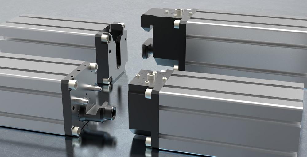 Nachrüstungen. Die Trennung zur Wechselschiene kann sowohl in vertikaler (Reihe PKV) als auch horizontaler (Reihe PKH) Richtung erfolgen. Die patentierte kraftverstärkende Keilspannmechanik schließt problemlos einen Fügespalt von bis zu 5mm zwischen Aktiv- und Passivteil. Diese Spannkinematik gewährleistet eine hohe Steifigkeit und Präzision der Verbindung. Die Spannkrafterzeugung wird durch eine elektrische Spannzustandsabfrage und eine Mindestspannkraft bei Druckabfall gewährleistet.