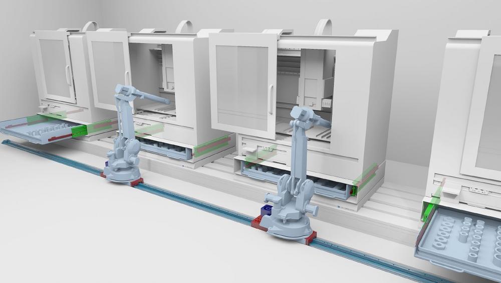 So lässt sich beispielsweise die Leistungsfähigkeit von Robotern mithilfe einer siebten Achse erheblich steigern. Dabei verfährt der Roboter auf einem Linearsystem und kann so Aufgaben an mehreren Orten übernehmen. Das Shuttle-System ist modular aufgebaut und ermöglicht lange Strecken und hohe Dynamiken. Für den Anwender ergeben sich dadurch nennenswerte Vorteile wie eine effizientere Auslastung, flexiblere Prozesse sowie geringere Kosten. Sieben verschiedene Größen für Roboter bis 2.000 kg decken nahezu alle Anwendungen ab.
