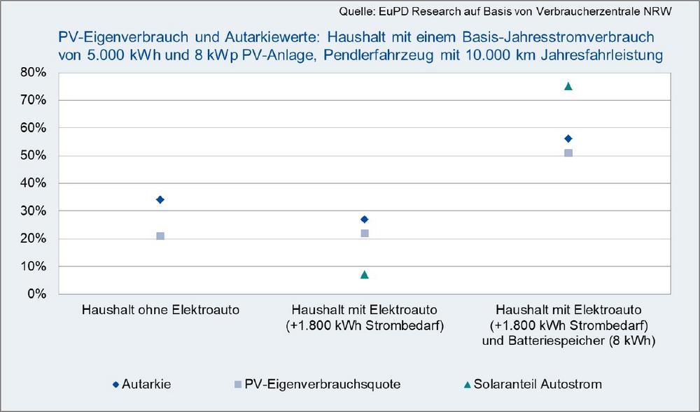 Exemplarisch lässt sich dies an einem Durchschnittshaushalt mit einem Jahresstromverbrauch von 5.000 kWh und einer PV-Anlage mit 8 kW installierter Leistung darstellen. Hier lassen sich ein Eigenverbrauchsanteil von rund 21% und ein Autarkiegrad von ca. 34% realisieren. Durch die Anschaffung eines Elektrofahrzeugs mit 10.000 km jährlicher Fahrleistung steigt der Strombedarf des Haushalts um etwa 1.800 kWh pro Jahr. Das Elektroauto ist grundsätzlich ein idealer neuer Verbraucher für den PV-Strom. Kann es jedoch tagsüber selten geladen werden, weil der Besitzer mit dem Auto unterwegs ist, dann steigt die Eigenverbrauchsquote des Solarstroms lediglich um einen Prozentpunkt. Der Autarkiegrad sinkt auf 27%.
