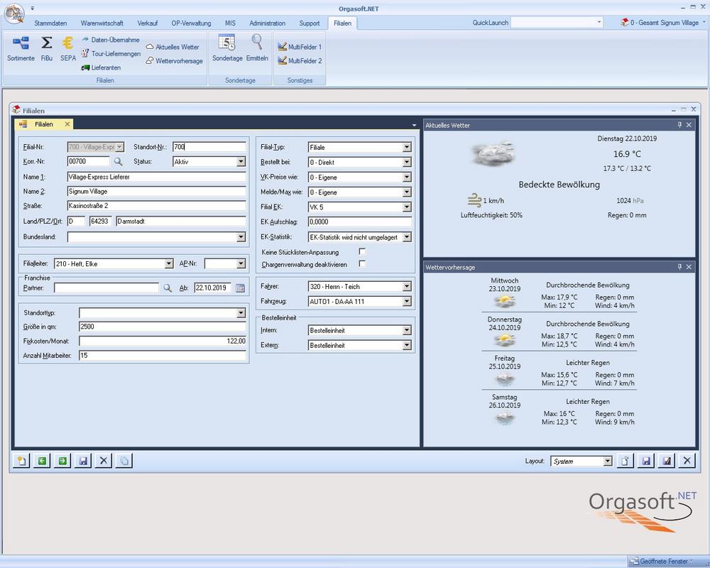 Das Wetter-Add-In können Anwender von Orgasoft.NET zusätzlich zu den Standardfunktionen der Warenwirtschafts-Software installieren. Dadurch wird im Programm die Wettervorhersage des aktuellen Tages sowie der nächsten vier Tage angezeigt.