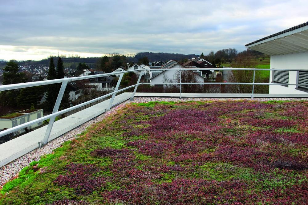 Ist das Arbeitsschutzgeländer Fallnet® ASG aufgebaut, folgt seine Ballastierung durch die Aufbringung des Dachbegrünungssystems. Dränage-, Substrat- und Pflanzschicht kommen auf den lastverteilenden Kunststoffplatten der Pfostenausleger zu liegen und sorgen so für die erforderliche Auflast. Dabei ist das Gewicht einer „normalen“ Extensivbegrünung in der Regel ausreichend. Bei einer Dachneigung von 0° bis 2° sind 80 kg/m² Trockengewicht zu beachten und bei einer Dachneigung von 2° bis 5° sind 100 kg/m² Trockengewicht der ZinCo-Systemerde bzw. des Dachbegrünungssubstrats einzuhalten. Diese Mindestauflast der Substratschicht gewährleistet die Lagestabilität des Fallnet® ASG und ist daher regelmäßig zu überprüfen. Auf diese Weise ist nun ein Arbeitsschutzgeländer auf dem Dach integriert, welches ohne Dachdurchdringung auskommt und damit entscheidende bautechnische Vorteile bringt.