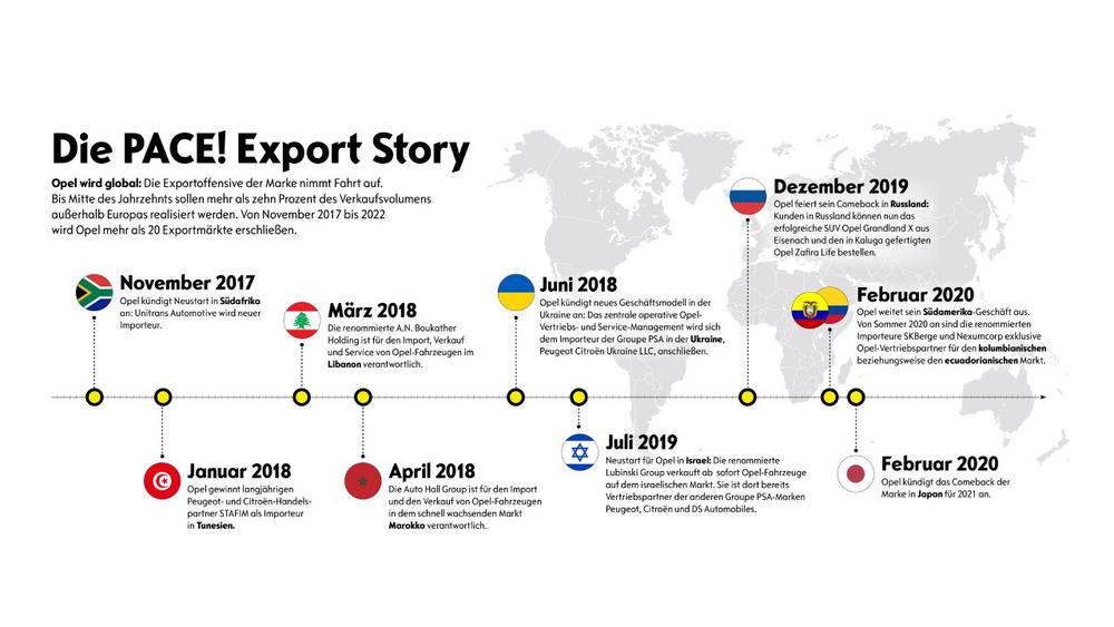Eine umfassende Exportoffensive ist eine Säule des Opel/Vauxhall-Strategieplans PACE! Bis Mitte des kommenden Jahrzehnts sollen mehr als zehn Prozent des Opel-Verkaufsvolumens außerhalb Europas realisiert werden. Um dies zu erreichen, stärkt die Marke ihre Präsenz in Exportmärkten in Asien, Afrika und Südamerika, auf denen sie bereits vertreten ist, und wird bis 2022 zudem mehr als 20 weitere neue Exportmärkte erschließen. Jüngste Beispiele sind etwa das Comeback in Russland oder der Markteintritt in den südamerikanischen Ländern Kolumbien und Ecuador.