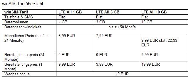 Für weniger als den Preis von 5 Kölsch steht dem Nutzer ein Handyvertrag mit monatlich 10 GB mobilem Datenvolumen sowie eine Flatrate für Telefonie und SMS zur Verfügung. Bei einer Vertragslaufzeit von 24 Monaten beträgt die Ersparnis 312 EUR. Auch für die flexible Tarifvariante mit einer Laufzeit von 1 Monat steht der Tarif bereit. winSIM belohnt darüber hinaus den Wechsel der Rufnummer mit einem Bonus in Höhe von 10 EUR.