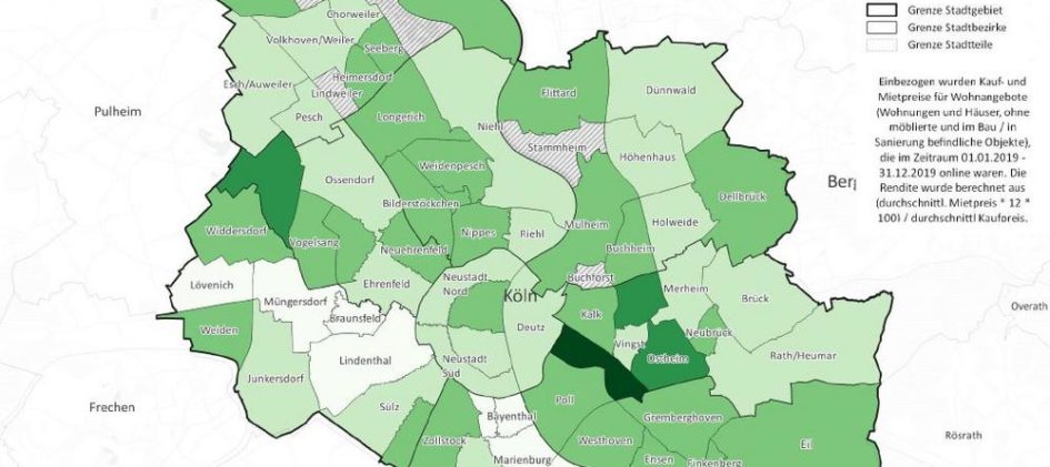Die höchste Rendite für Wohnungen in Köln lässt sich im Stadtteil Meschenich im Stadtbezirk Rodenkirchen erzielen. So lag die Bruttomietrendite bei 5,4 Prozent im Jahr 2019. Auf den Plätzen folgen die Stadtteile Humboldt/Gremberg und Ostheim, beide im Stadtbezirk Kalk, mit 4,6 Prozent bzw. 4,3 Prozent. Die niedrigste Rendite wurde im Stadtteil Hahnwald, Stadtbezirk Rodenkirchen erzielt. […]