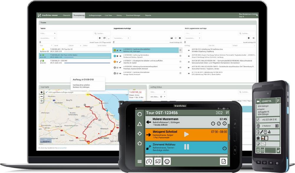 In der Cloud-Plattform tranSvias viewer werden die mobilen Prozesse in Echtzeit abgebildet, verfolgt und ausgewertet. Sie dient auch als Kommunikationsplattform. Dies einerseits über das Portal mit den mobilen Mitarbeitern und andererseits auf Serverebene für den Austausch mit vor- oder nachgelagerten peripheren Systemen wie ERP oder dedizierte Dispo-Programme über standardisierte Webservices. So steht auch der zeitnahen Fakturierung der erbrachten und im Detail dokumentierten Leistungen nichts mehr im Weg.