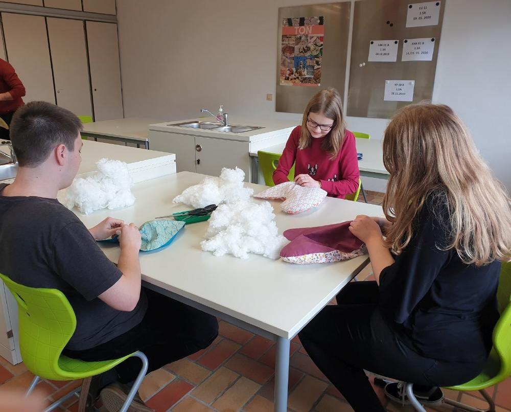 Mit einem guten Auge für harmonische Farben hat Bettina Meier die Stoffe ausgewählt. Sie unterrichtet an den beruflichen Schulen in Ahornberg im Bereich Kinderpflege, Ernährung und Versorgung. In der Zeitung verfolgte sie einen Bericht über Carmen Lang, die Herzkissen für die Patientinnen des Sana Klinikums Hof genäht hat. Sie nahm direkt Kontakt zu ihr auf, lies sich die Schnittmuster senden und machte sich mit ihrer Klasse EV 11 im Fach "Textiles Gestalten" direkt ans Werk. „Bei meinen Schülerinnen und Schülern kam diese Idee sofort sehr gut an. Sie haben sich gefreut, an einem solchen Projekt teil zu nehmen. Auch die Schulleitung hat sofort grünes Licht gegeben und im Rahmen des Schulhaushalts die Kosten übernommen.“, berichtet Kursleiterin Bettina Meier. Und so schnitten Jungs wie Mädels die Stoffe zu, nähten und befüllten die Herzen. „Uns hat besonders motiviert, dass die Herzen für einen guten Zweck sind.“, sagte Schülerin Michaela Seuß bei der Übergabe. Das besondere an den Herzen ist die persönliche Widmung, die jeder Schüler mit einem selbstgestalteten Anhänger der zukünftigen Besitzerin mit auf den Weg gegeben hat. Bettina Meier kann sich gut vorstellen mit der nächsten Klasse das Projekt zu wiederholen.