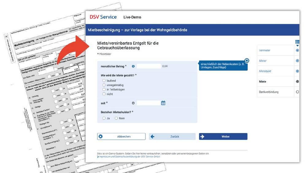 Ein weiteres häufig in Kommunen genutztes Formular ist die Mietbescheinigung zur Vorlage bei der Wohngeldbehörde. Dieses Online-Formular steht auf der Website der DSV Service auch als Demo zur Verfügung. So können sich Interessenten ein eigenes Bild von der digitalen Umsetzung eines spezifischen Formulars machen. Die Papierversion wurde für den Online-Einsatz in einen benutzerfreundlichen Formular-Assistenten umgewandelt. Formular-Assistenten bauen Hürden ab, indem sie den Nutzer interaktiv durch die individuell erforderlichen Bereiche führen. Sie erhöhen mit gezielter Hilfestellung und umfassenden Prüfungen die Qualität der eingehenden Daten in großem Maß und sorgen so für Effizienz in der weiteren Bearbeitung.