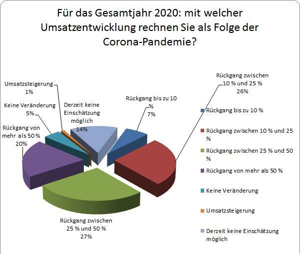 Unternehmen beklagen insbesondere einen Rückgang der Nachfrage (66 Prozent), die Stornierung von Aufträgen (52 Prozent) sowie den Stillstand der geschäftlichen Tätigkeit (50 Prozent). Über Liquiditätsengpässe berichten 44 Prozent; eine drohende Insolvenz gaben 13 Prozent an. Positiv werden das Kurzarbeitergeld, die Soforthilfen in Form von Zuschüssen und Steuerstundungen eingeschätzt. Dennoch fordern 73 Prozent der Unternehmen weitere staatliche Zuschüsse und 53 Prozent sprechen sich für Steuersenkungen aus. 38 Prozent der Unternehmen gehen von einem Personalabbau in Folge der Coronakrise aus.