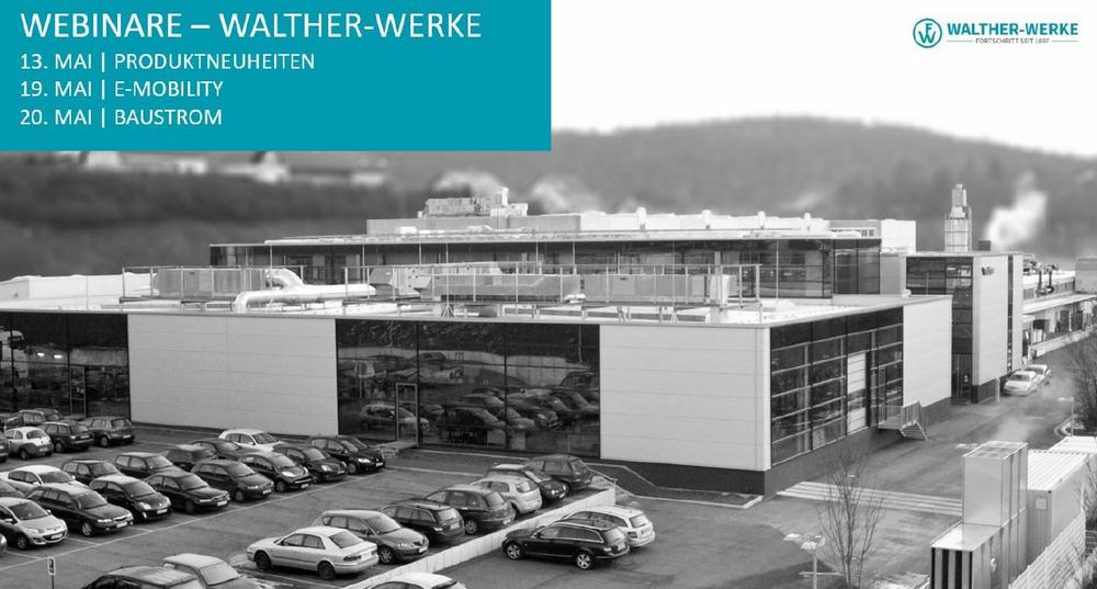 Als ausgewiesene Experten im Bereich Systemlösungen für die Elektroinstallation genießen die WALTHER-WERKE seit über einem Jahrhundert hohes Ansehen und das Vertrauen des Handwerks. Im Jahr 1897 in Grimma bei Leipzig gegründet, produziert und vertreibt das heute im pfälzischen Eisenberg ansässige Unternehmen, das weltweit mehr als 400 Mitarbeiter beschäftigt, zukunftsorientierte, intelligente Produkt- und Systemlösungen in hoher Design-Qualität. Das umfangreiche Portfolio umfasst die Entwicklung, Fertigung und den Vertrieb von CEEtyp-Steckvorrichtungen, Steckdosenkombinationen, Industriesteckverbindern, Ladeinfrastruktur für Elektromobilität, Stromverteilern und Trafostationen. Durch intensive Kontakte mit dem Großhandel, dem Handwerk, der Industrie und Planern entwickelt WALTHER die Produkte und Lösungen ständig weiter. Für Kooperationspartner bieten die WALTHER-WERKE zudem Schulungen und Seminare an, um die perfekte Montage der eigenen Produkte aktiv gewährleisten zu können. Das Traditionsunternehmen unterhält Tochterfirmen in Österreich, England, Frankreich und den USA. Dazu kommen rund 60 WALTHER-Vertretungen weltweit.
