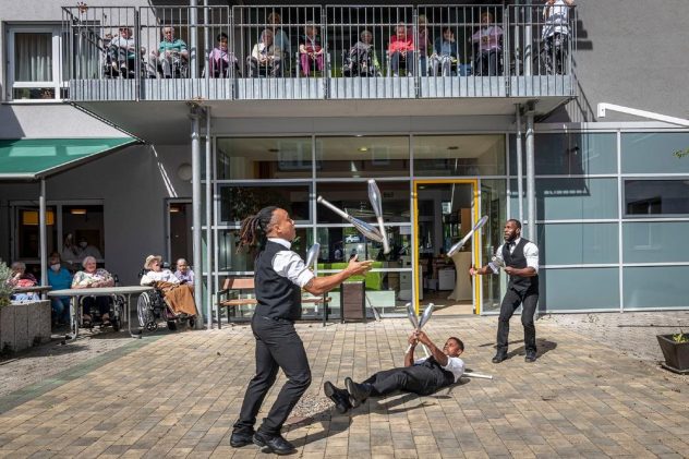 Mit Flickflack und Jonglage Farbe in den Alltag bringen – Europa-Park Artisten treten vor Seniorenheimen auf