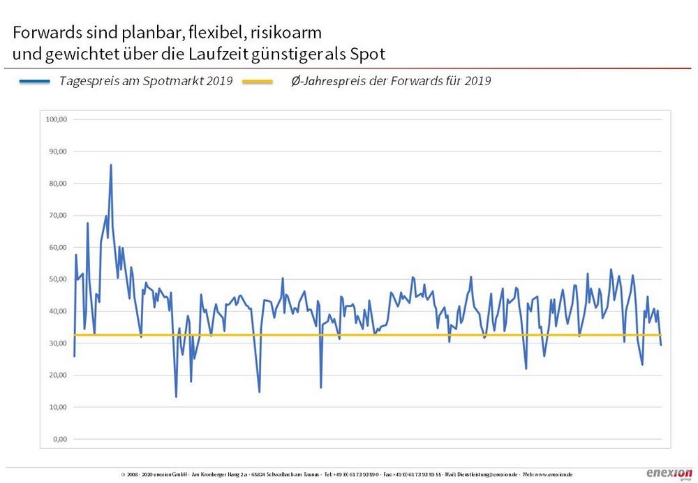 Der Spotmarkt kann in bestimmten Marktphasen deutlich unter den vorlaufenden mittleren Großhandelspreisen für Jahreslieferungen liegen, deshalb ist eine intelligente, fallweise Einbindung des Spotmarkts grundsätzlich vorteilhaft. Starre Regeln oder eine ausschließliche Spotmarktbeschaffung ohne je nach Marktentwicklung frühzeitigem Portfolioaufbau sind dagegen eine schlechte Wahl: „Ich muss am Tag X den Spotpreis akzeptieren – ob er mir gefällt oder nicht. Die einzige Alternative ist, meine Anlagen abzuschalten“, erklärt enexion-Vertriebsleiter Christoph Trares. Er ergänzt: „Viele Unternehmen schätzen den Spotmarkt falsch ein, da man sich gerne an die Tage erinnert, an denen der Spotmarkt sehr niedrig oder sogar im Minus lag. Diese Eindrücke bleiben anscheinend oft jahrelang im Gedächtnis hängen, selbst wenn der Spotmarkt danach über Monate über den Forwards lag. Auch wird vergessen, dass der Großhandelsmarkt inzwischen Beschaffungsmöglichkeiten bis zu fünf Jahre in die Zukunft ermöglicht, sodass die flexible Kombination aus allen Elementen je nach Marktentwicklung das richtige, weniger spekulative Vorgehen darstellt."
