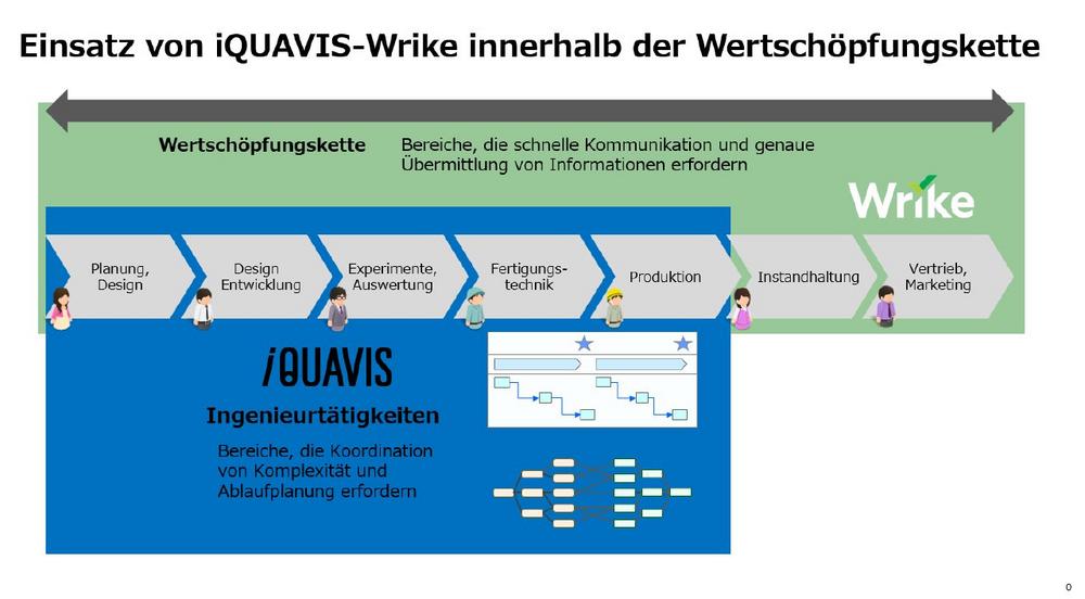 Während iQUAVIS bislang maßgeblich bei vielen japanischen Unternehmen eingesetzt wird, ist Wrike™ eine globale Kollaborationsplattform, die von mehr als 20.000 Unternehmen weltweit eingesetzt wird. iQUAVIS-Wrike als eine Projektmanagement-Lösung für die Fertigungsindustrie wird bereits von etwa 100 großen Fertigungsunternehmen zur Visualisierung von groß angelegten und komplexen Produktentwicklungsprozessen eingesetzt.