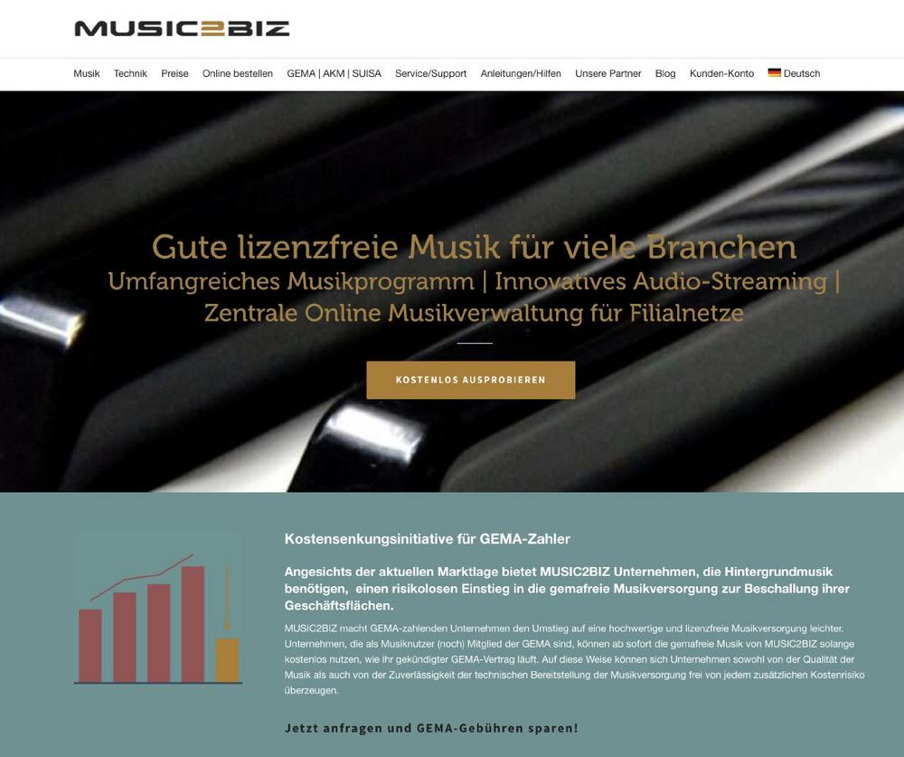 Den Service bietet MUSIC2BIZ über optimal auf Kundenbedürfnisse abgestimmte Musikflatrates an. Die zu 100 Prozent GEMA-freie Musik kann über handelsübliche Audiotechnik empfangen und abgespielt werden. Dadurch bietet die MUSIC2BIZ-Lösung Unternehmen einen besonders hohen Komfort und erspart ihnen gleichzeitig die Investition in proprietäre Hardware.