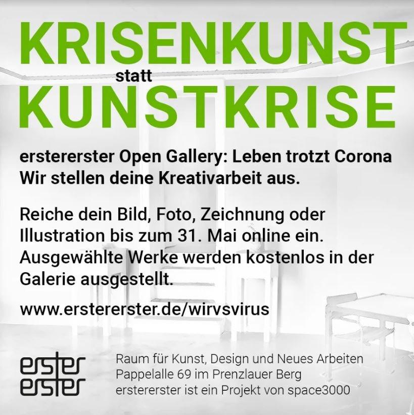 Mit der Open Gallery Aktion “Krisenkunst statt Kunstkrise” bietet die Berliner Galerie erstererster eine Bühne für Kreativarbeiten, die in der Corona Krise entstanden sind. “Unter dem Motto Leben trotzt Corona, freuen wir uns auf Einreichungen, die sich mit dem neuen Alltag, Kuriositäten, Ängsten oder Hoffnungen auseinandersetzen. Wir möchten insbesondere Arbeiten von Menschen zeigen, die bisher noch nicht ausgestellt haben und vielleicht nie darüber nachgedacht hätten. Also traut euch!” erklärt Miriam Soltwedel vom erstererster-Team die Aktion.